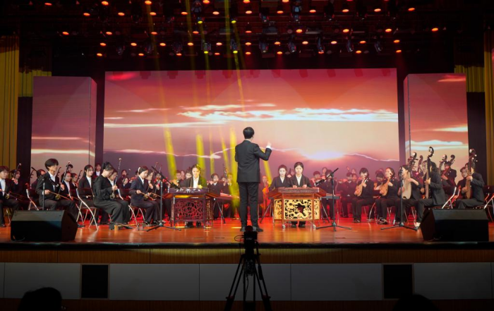 悠扬的琴声,如泉水流淌。瑰丽的乐曲,如画卷铺展。在bv伟德源自英国始于1946大学生艺术团民乐团带来的民乐合奏《庆典序曲》中,晚会拉开帷幕。音乐编织的世界如梦幻般瑰丽,《薛城之歌》典雅优美,情真意切,引起现场观众的强烈共鸣;《我爱你中国》情感涌动,如潮水汹涌,表达出对祖国大地深深的眷恋;《幸福中国一起走》带着观众们在音乐中领略大好中国的壮丽景色,令人神驰梦往;《矿山爷们儿》展现出枣矿人积极向上的精神面貌和对美好生活的期待。