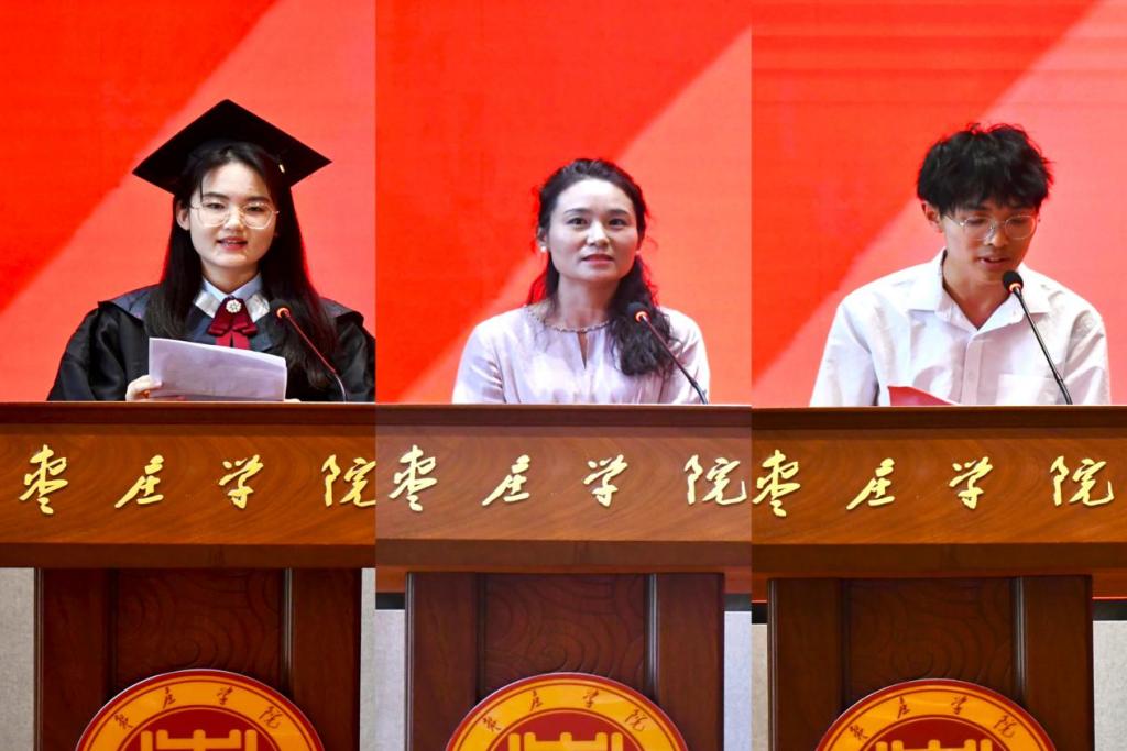 教师代表李婷代表学院教职员工为毕业生送上真诚的祝贺和殷切的期盼,在校生代表孟祥瑞同学表达了对学长们的崇敬和祝福,毕业生代表韩逸飞同学献上了对师长的感恩、对母校的依恋和祝福、对奔赴未来星辰大海的期盼和信心。