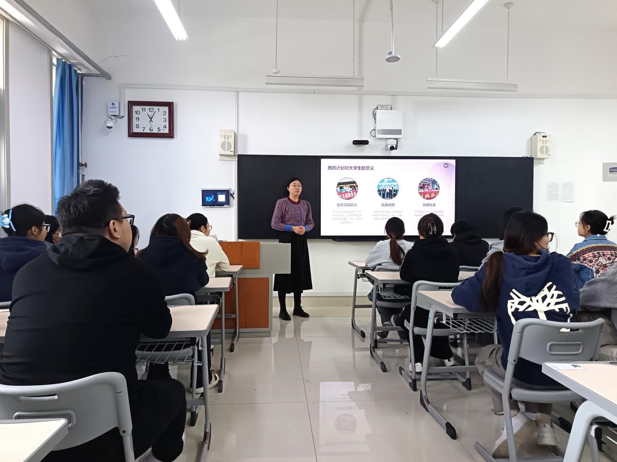 韩晓瑞老师以详实的数据为依托,针对西部计划的内涵以及相应的招募条件进行了细致解读,重点讲解了西部计划的主要服务内容。系统分析了大学生投身西部计划的优势,深入剖析了其在个人成长与未来发展层面的积极意义和显著价值,并从西部计划政策的实施与成效入手,详细介绍了西部计划的资金保障。活动最后,韩晓瑞鼓励同学们积极参与,以实际行动响应国家号召,为西部发展贡献力量。