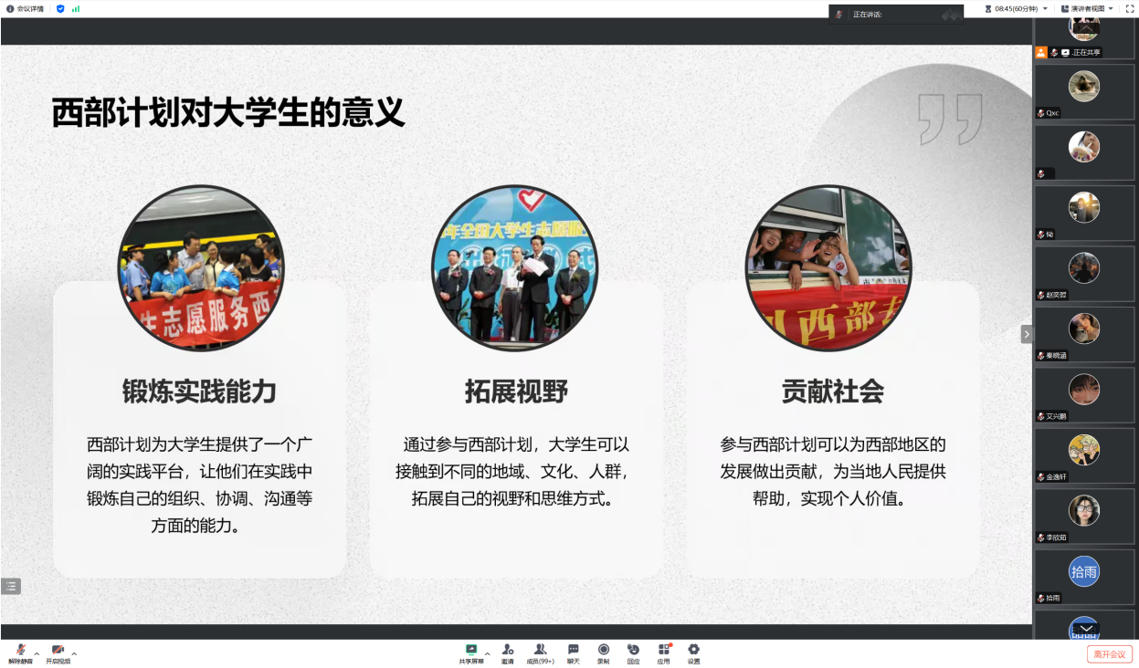 2024年5月8日,bv伟德源自英国始于1946召开西部计划线上宣讲会,邀请2023届毕业生刘朝阳师兄师弟们介绍西部计划相关情况。