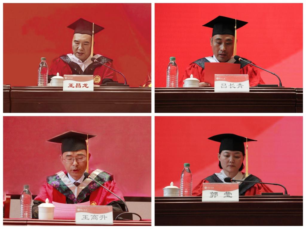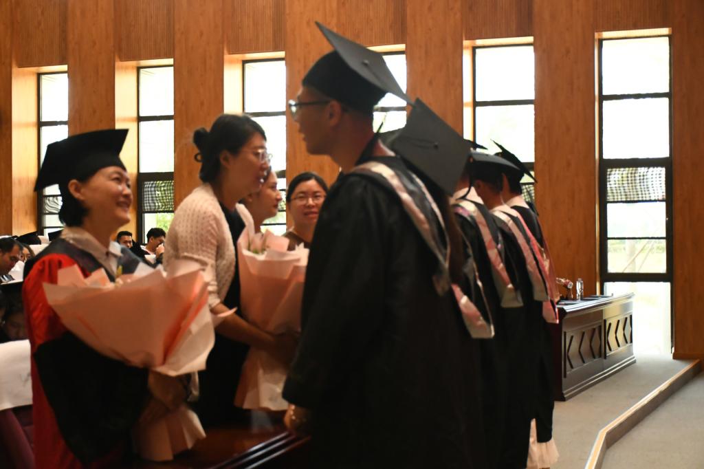 李目海副校长为毕业生逐一拨穗正冠、授予学位,颁发毕业证书并合影留念。