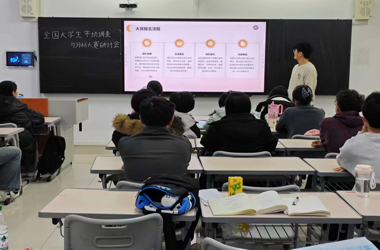 此次研讨会采用“案例拆解+分组研讨”模式,共计20余名备赛学子参与活动。主讲人结合往届获奖案例,拆解市场调研全流程,内容涵盖选题评估、问卷设计、数据收集等关键环节,同时结合反面案例剖析样本选取、问卷设置、数据分析等方面的高频备赛误区进行讲解。在分组研讨环节,学生们围绕交叉分析运用等议题深入交流,并结合案例模板构思备赛思路;活动尾声,各小组分享成果,主讲人精准点评,并为学生发放优秀案例集助力备赛。