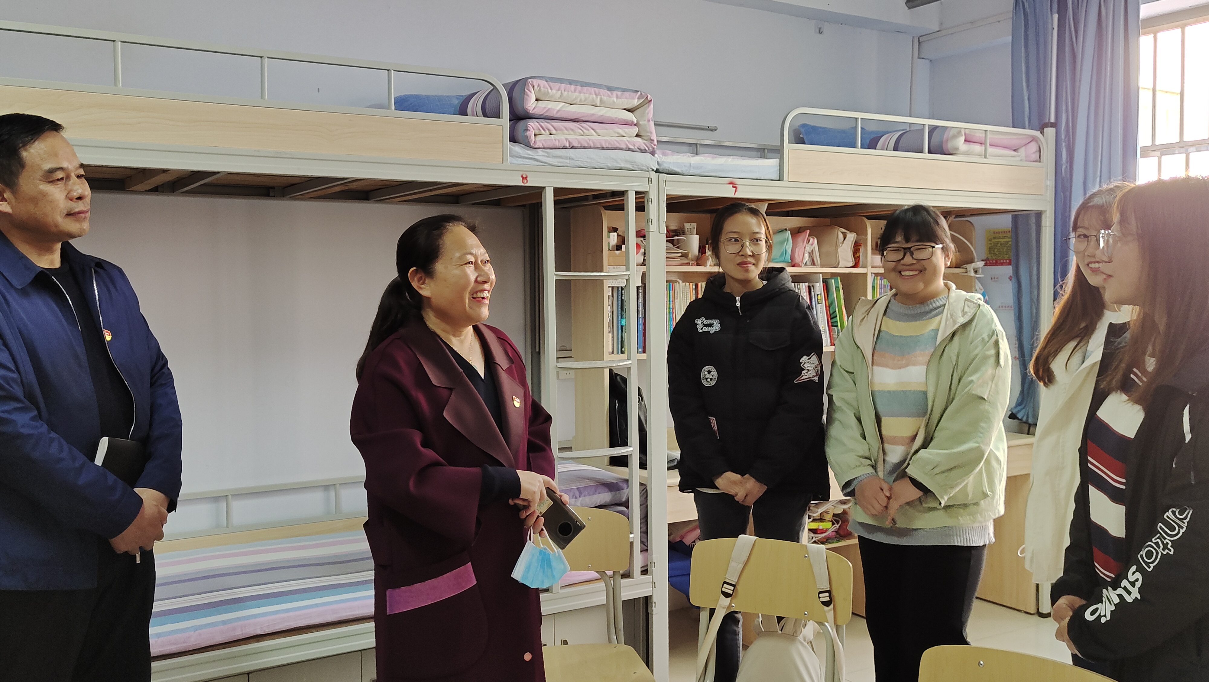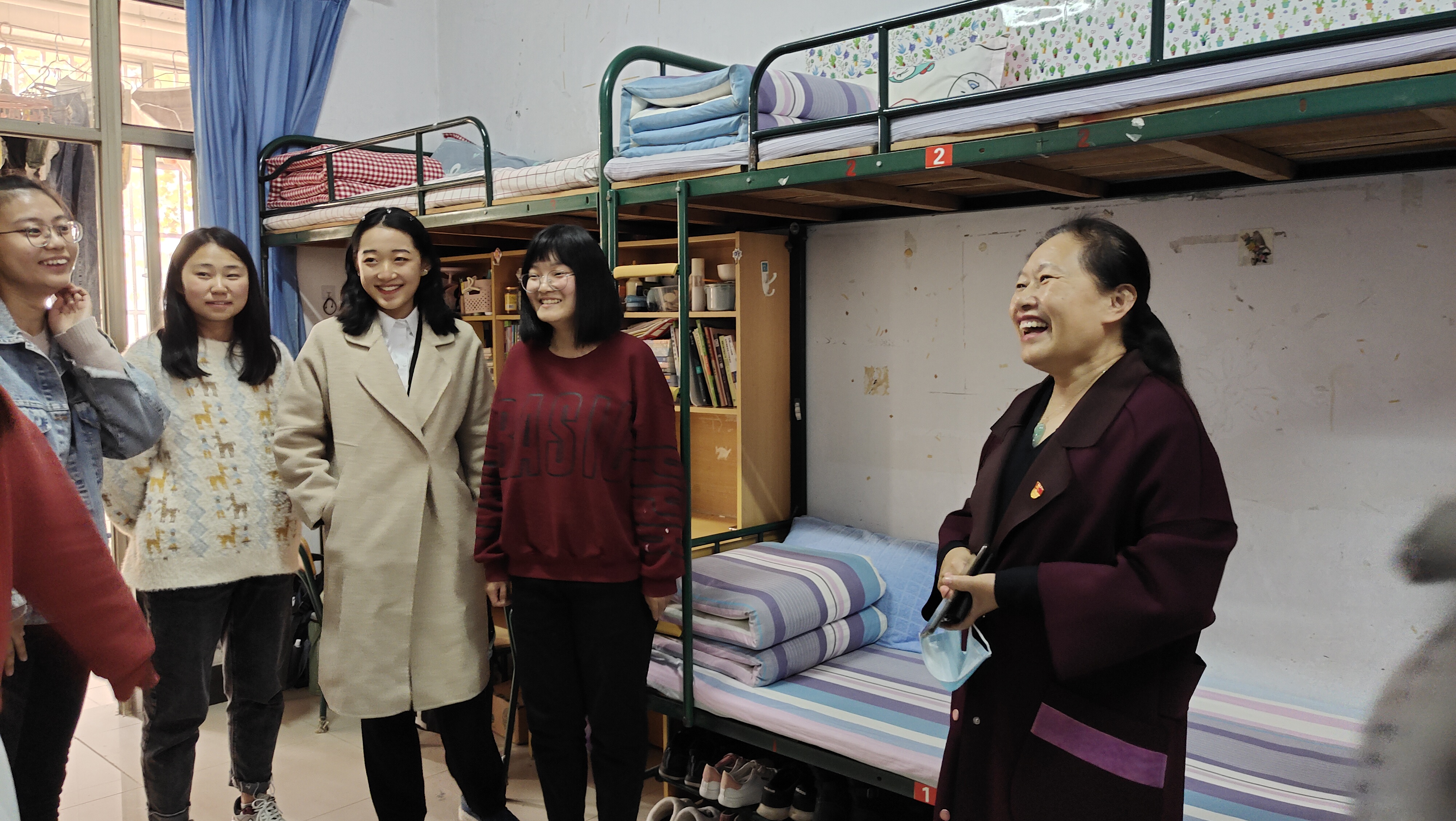 各支部党员一起深入学生13号楼女生公寓和16号楼男生公寓,李丽清走访了部分女生宿舍并与2020级新生进行了亲切交流,详细询问了新生入学后在学习、饮食、住宿等方面的适应情况,了解学生所思所想以及生活需要,嘱咐同学们要多注意身体。她希望同学们把学校当做一个大家庭,能够相互关照,加强沟通交流,增进彼此之间的感情。最后,李丽清对同学们提出了殷切的期望,她要求同学们要树立远大理想,做好大学期间的学习生活规划,不断提升自身综合素质,不辜负大学美好时光。交流过程中同学们热情高涨,笑语连连,充分感受到了李丽清副校长亲切的关怀,纷纷表示领导的谈心谈话让她们深受鼓舞,决心要刻苦学习,以优异的成绩回馈学校和社会。