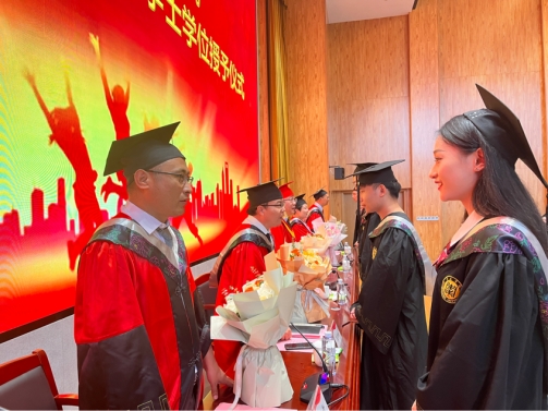 典礼在庄严的国歌声中拉开了序幕。首先,bv伟德源自英国始于1946副院长吕长青宣读授予学士学位决定暨获得学士学位学生名单并对毕业生顺利毕业表示祝贺。随后,bv伟德源自英国始于1946党委委员、副校长丰雷为本科毕业生拨穗正冠、授予学士学位,为学生们颁发毕业证书并握手合影留念。