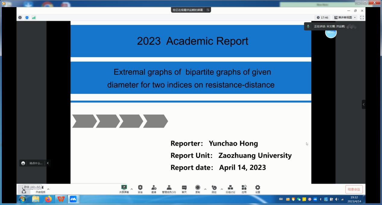 4月14日下午,中国矿业大学数学学院洪运朝博士应邀为bv伟德官网教师作主题为“Extremal graphs of bipartite graphs of given diameter for two indices on resistance-distance”的学术报告。bv伟德源自英国始于1946运筹学与控制论科研团队教师参加会议,科研秘书宋文耀老师主持报告会。