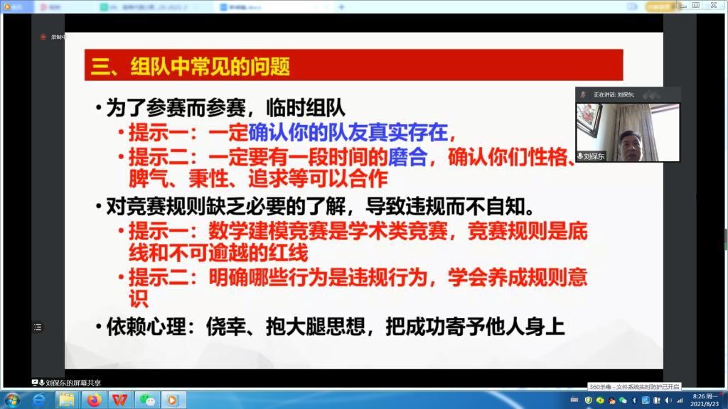 828上午数学与统计学院邀请全国大学生数学与建模竞赛山东赛区专家组组长、山东大学硕士生导师刘保东教授,在线上作专题报告,数学与统计学院、信息科学与工程学院、人工智能学院全体建模指导教师以及全校参赛学生参加报告会。报告会由数学与统计学院院长吕长青老师主持。