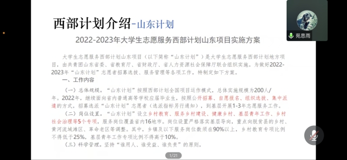 此次交流大会由21届优秀毕业生苑思雨同学分享自己在新疆志愿服务的经验与感想,由韩晓瑞老师负责本次交流大会的主持工作。