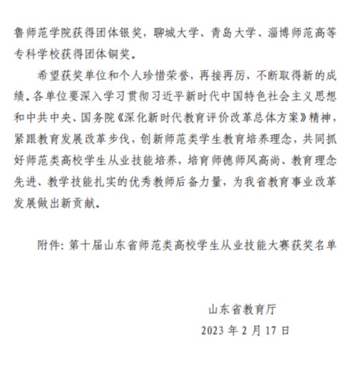 宝剑锋自磨砺出,这一成绩的取得,离不开学院领导的统筹规划、积极推进,离不开指导教师团队的精心指导,离不开参赛同学的刻苦磨炼、精雕细琢。师范类高校学生从业技能大赛对学生就业、个人能力提升、专业知识巩固具有至关重要的意义,自大赛公布之日起,学院积极组织学生参加,为做好充分的准备,在王振立、华瑞两位老师的指导下,鲍新雨、孙利彤两位同学过关斩将,表现优异,克服疫情影响,统筹考研学习,在每次的试讲中发现不足,在每次的教案准备中填补空缺,从紧张到放松,从缺少经验到游刃有余,最终取得优异成绩。